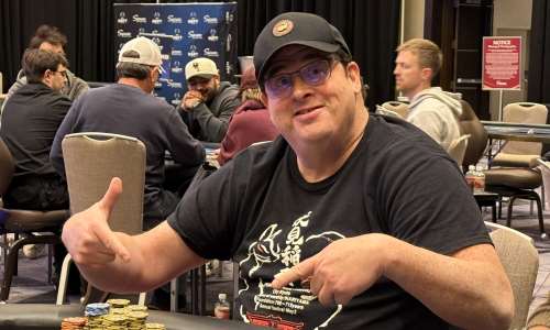 Brad Miller of Pleasanton, CA bagged the chip lead (765,000) in Event #2: $400 Mini Main NLH Day 1B which saw 12 of 104 entrants advance to Day 2, all in the money!